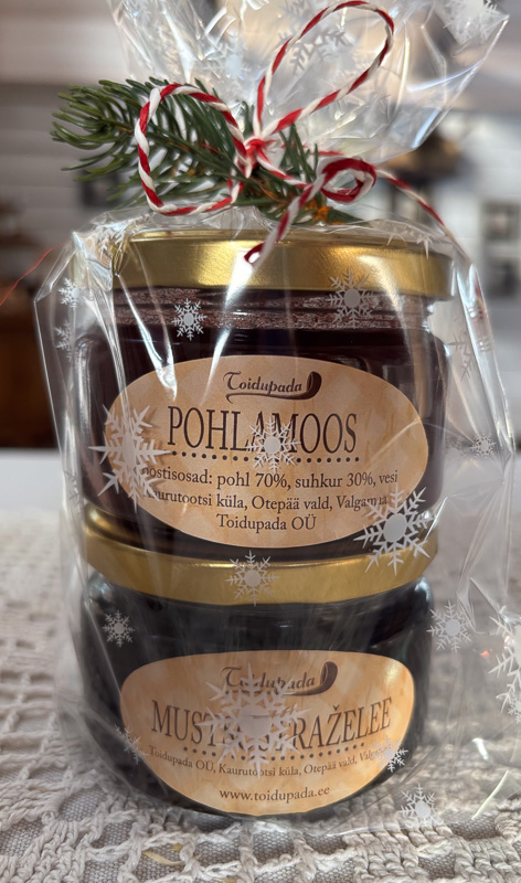 Mustsõstraželee 200 g; koostisosad: mustsõstra mahl 36%, vesi 30%, suhkur 27%, sidruni mahl 6%Hind: 11 €